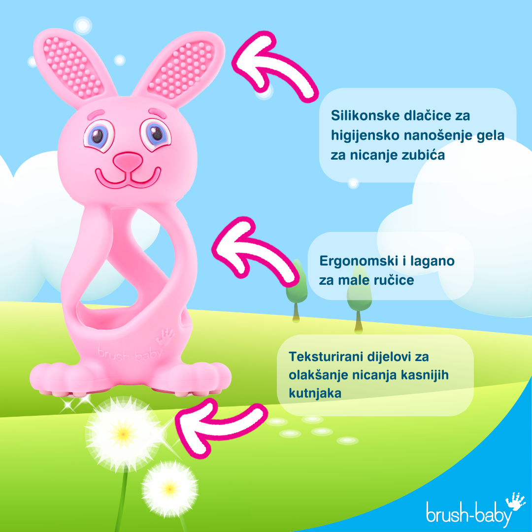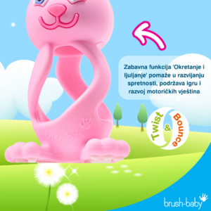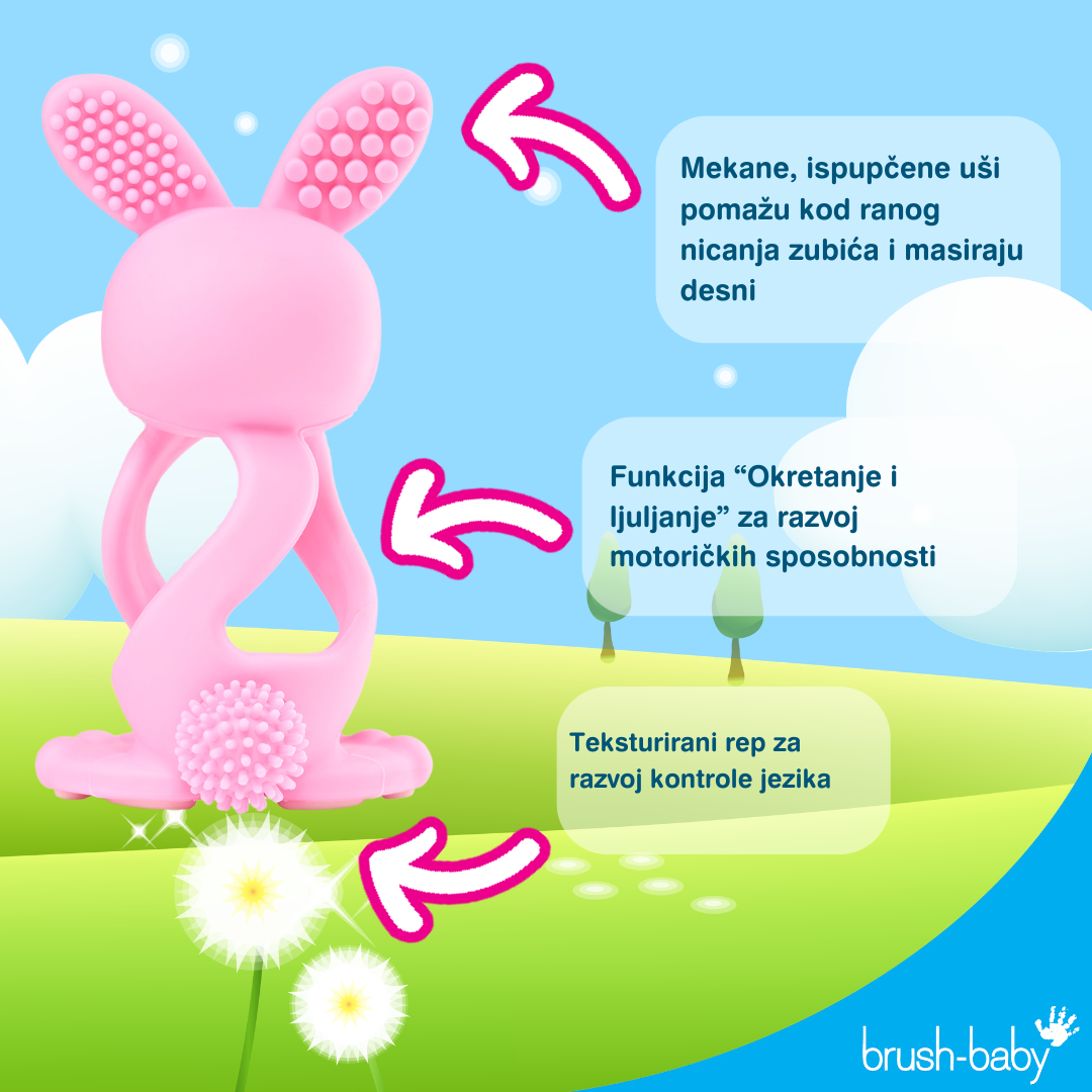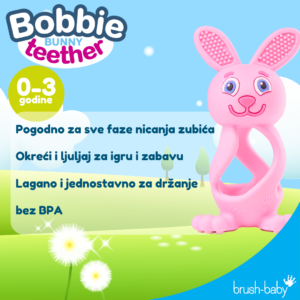 Predstavljamo brush-baby Bobbie Bunny – preslatku i praktičnu glodalicu u nježnoj ružičastoj boji. Bobbie Bunny je dizajniran s posebnom pažnjom: mekana je, sigurna i savršeno prilagođena malenim rukama, što je čini idealnim suputnikom kroz razdoblje nicanja zubića.