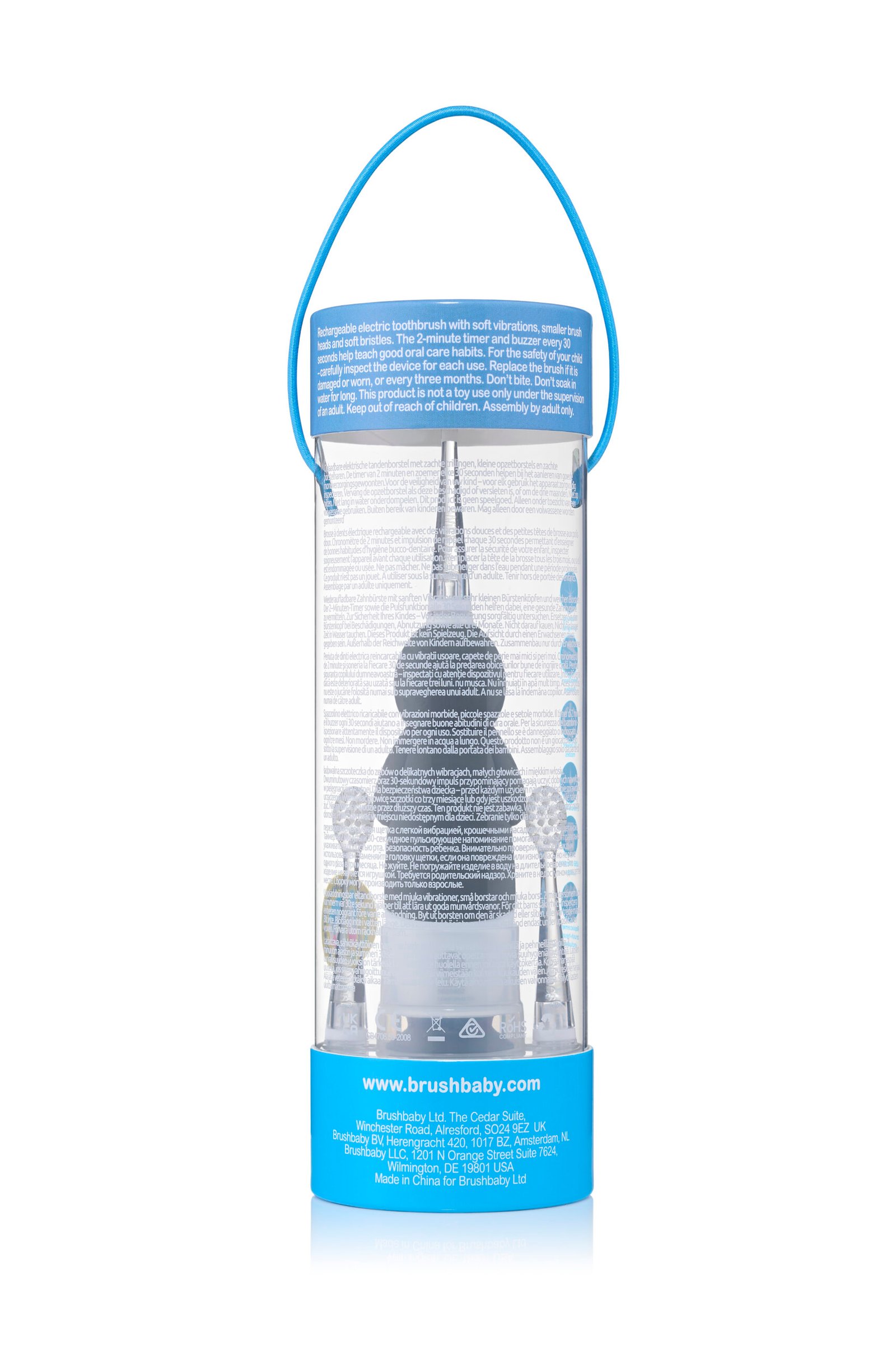 Četkica je opremljena automatskim dvominutnim mjeračem vremena i podsjetnikom svakih 30 sekundi koji signalizira djetetu da prijeđe na sljedeći dio usne šupljine. Ugrađeno svjetlo dodatno zabavlja i animira dijete. Uz četkicu dolaze i meke zamjenske glave za potpuno sigurno čišćenje.